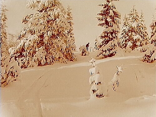 Vintermotiv, snöiga träd, en skidåkare.