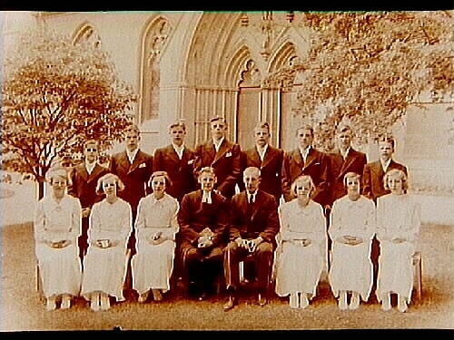 Konfirmander, sex flickor, åtta pojkar och dövstumspastor Carl-Åke Areskog.