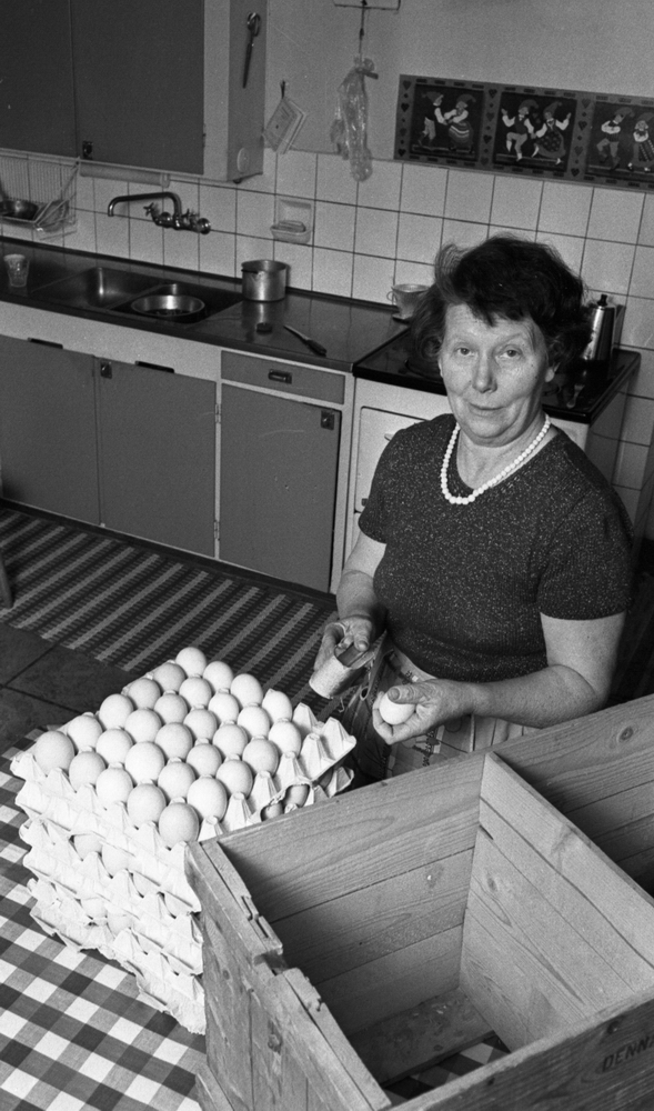På bilden syns en kvinna som håller ett ägg i sin vänstra hand och i sin högra hand håller hon i en borste för att kunna polera äggen. Kvinnan är klädd i en klänning med förkläde och har pärlhalsband runt sin hals. I bildens bakgrund syns köksutrustning med spis, ugn , diskbänk och vattenkran samt skåp. I förgrunden syns trälådor samt äggkartonger fyllda med ägg.