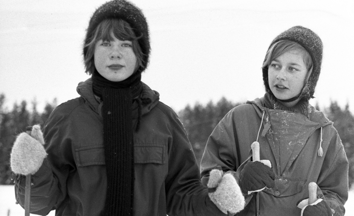På bilden i förgrunden syns det två flickor som är klädda i vinterkläder. Flickorna har stickade mössor på sina huvuden. Flickan åt vänster har stickade vantar på sina händer och en lång stickad skarf runt sin hals som hänger ner. Båda flickor håller skidstavar i sina händer.