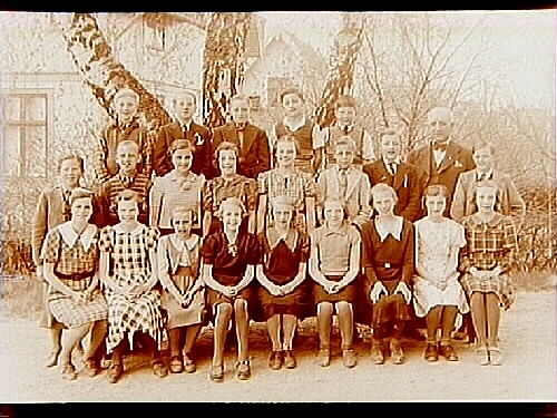 Rynninge skola, 12 flickor och 9 pojkar med lärare Sam. Nystedt på skolgården.