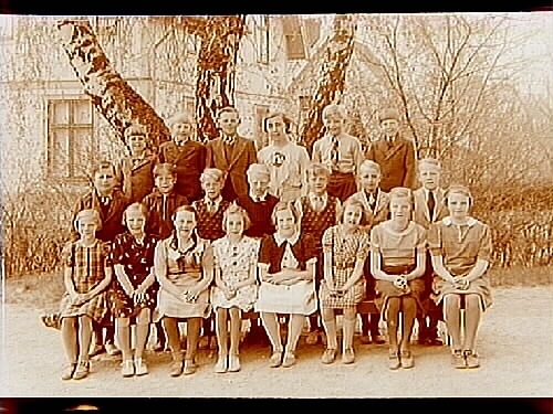 Rynninge skola, 8 flickor och 12 pojkar med lärarinna fru Eva Dahlen på skolgården.