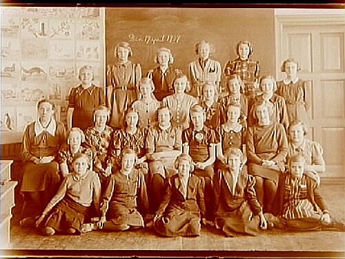 Vasaskolan, klassrumsinteriör, 24 flickor med lärarinna fröken Svea Elander.