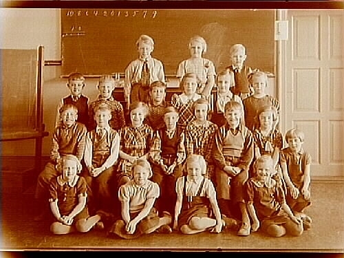 Vasaskolan, klassrumsinteriör, 11 flickor och 10 pojkar med lärarinna fröken Ebba Hansson, sal 7.