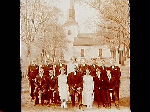 Konfirmander, 3 flickor, 11 pojkar och kyrkoherde Sköldebrand.