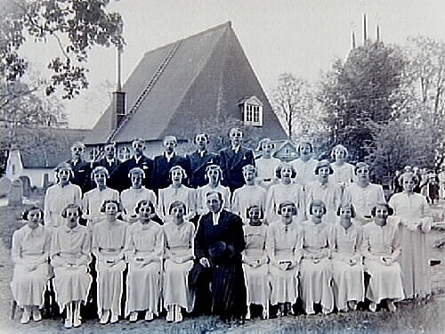 Konfirmander, 23 flickor, 6 pojkar och kyrkoherde Ivar Thorell.