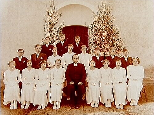 Konfirmander, 11 flickor, 8 pojkar och prosten Areborg.