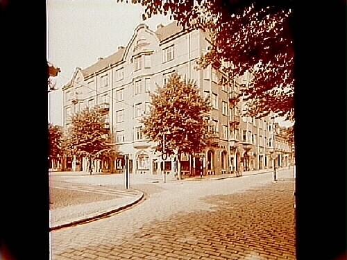 Stenhus i fem våningar. Fasaden har bottenvåningen i släthuggen sandsten, översta våningen i gul slätputs och mellanliggande våningar i grå slätputs. Fasaden har fem burspråk med frontoner och fyra balkonger med dekorativt smide.