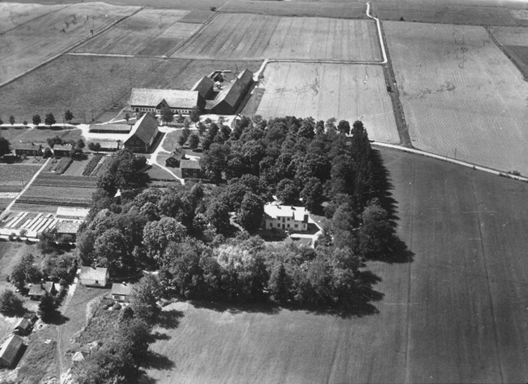 Flygfoto över Torps Egendom, Kräcklinge, bostadshus och ekonomibyggnader.