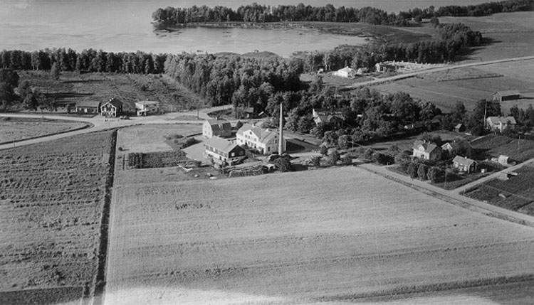 Flygfoto över Vretstorp, bostadshus och fabriksbyggnader.