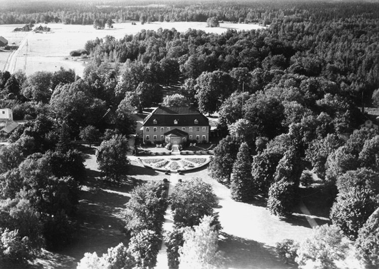 Flygfoto över Bystads Herrgård, tvåvånings herrgårdsbyggnad.