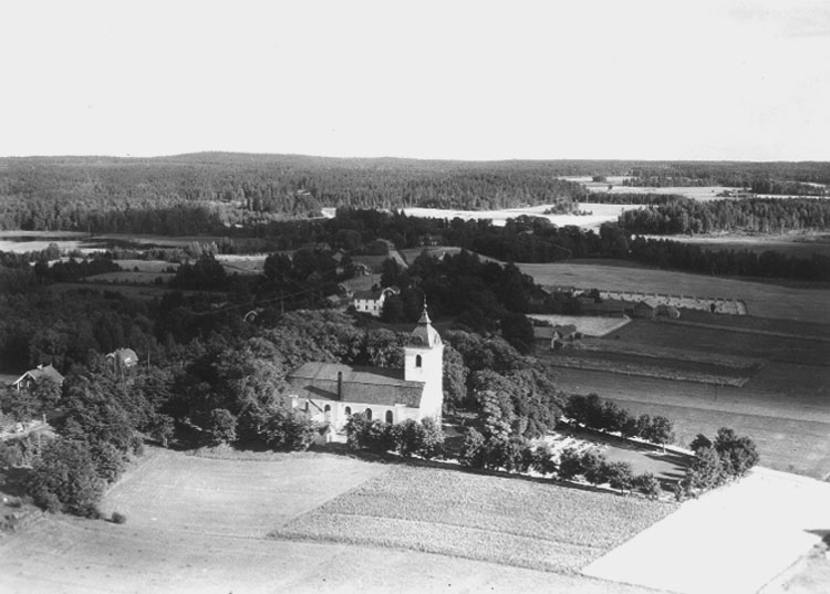Flygfoto över Svennevad, kyrkan, bostadshus och byggnader.