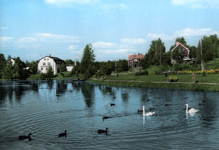 Kopparberg, parti från ån med svanar. Snickerifabriken och bostadshus.