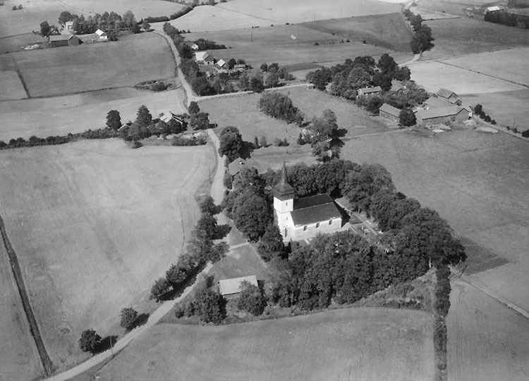 Flygfoto över Hackvad, kyrkan och bostadshus.