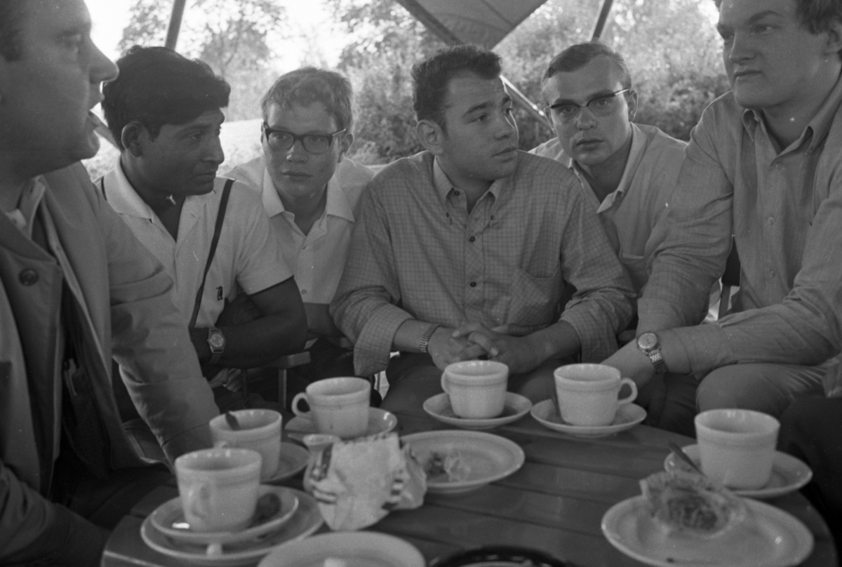 Sex unga män sitter utomhus kring ett runt bord som har fullt med kaffekoppar, fat och assietter på sig. Fyra stycken av männen är klädda i skjortor, en har T-tröja och en bär jacka.