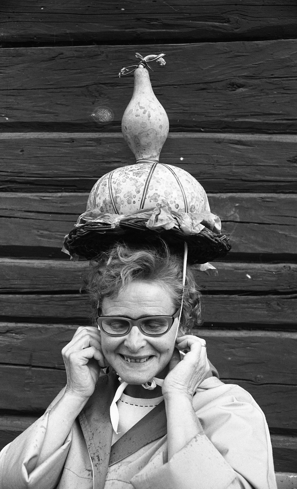 Närbild på en leende kvinna som befinner sig i Wadköping i Örebro. Hon är klädd i en lustig hatt. Hon bär glasögon och är klädd i en ljus blus och en ljus kappa.