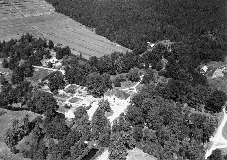 Flygfoto över Skagersholms Gård, bostadshus och ekonomibyggnader.