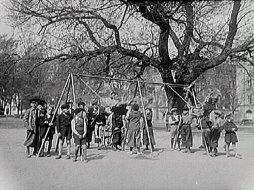Oskarsparken, lekplatsen med två gungor, lekande barn.