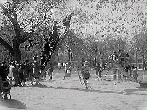 Oskarsparken, lekplatsen, kö vid rutschbanan, lekande barn.