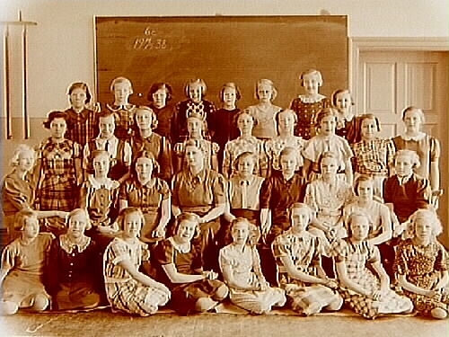 Titel: Vasaskolan, klassrumsinteriör, 32 flickor med lärarinna fröken Margit Svensson, klass 6c, sal 14.