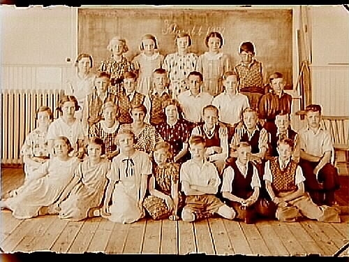 Almby skola, klassrumsinteriör, 28 skolbarn med lärarinna fru Johansson, klass 6b.