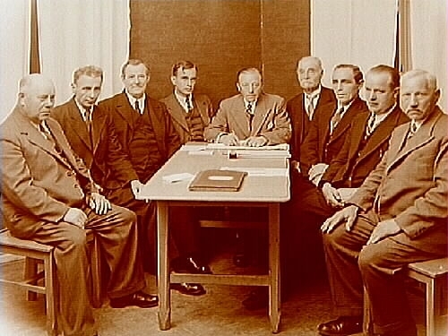 Längbro Pensionsnämnd, nio herrar runt ett bord.