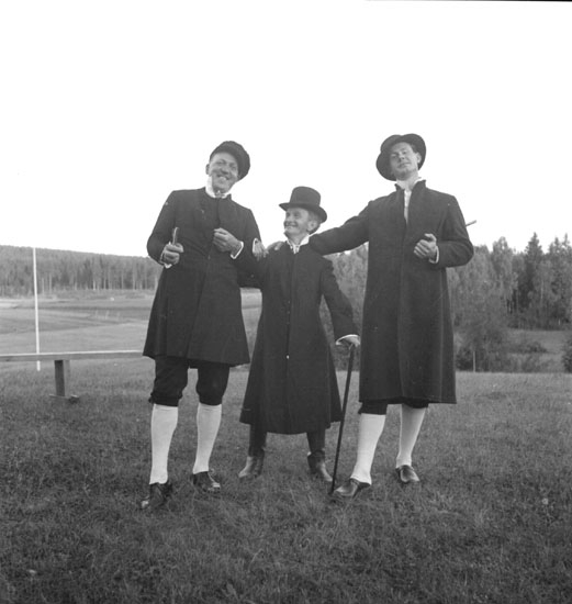 Festligheter vid Siggebohyttan den 30 juli 1937. Tre utklädda män spelar teater eller är uppklädda till dans.