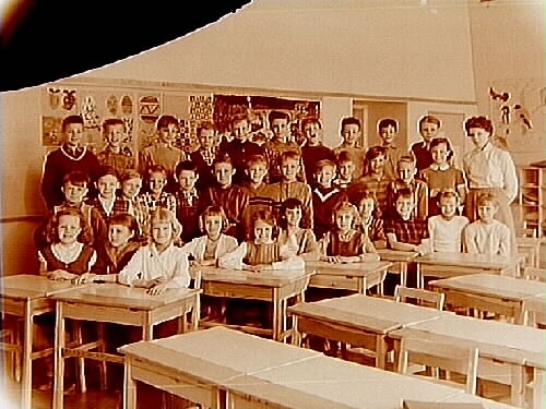 34 skolbarn och lärarinna fröken Inger Yman, vikarie för fru Rosenberg.