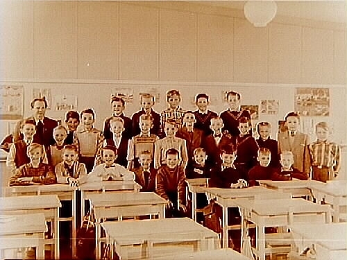 Rostaskolan, klassrumsinteriör, 27 pojkar och lärare Kjell Rudner, klass 4D, sal 16.