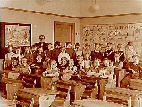 Titel: Engelbrektsskolan, klassrumsinteriör, 28 skolbarn med lärarinna fröken Emmy Söderlund, klass 2am, sal 8.