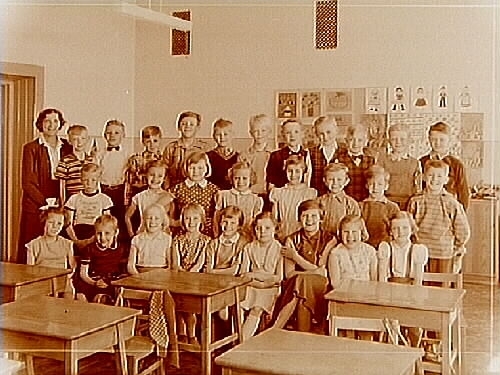 Titel: Olaus Petriskolan, klassrumsinteriör, 28 skolbarn med lärarinna fröken Anna Thyresson, klass 2a, sal 18.