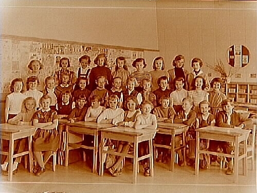 Vasaskolan, klassrumsinteriör, 34 skolbarn med lärarinna fröken Aina Ahnmark, klass 4o, sal 1.