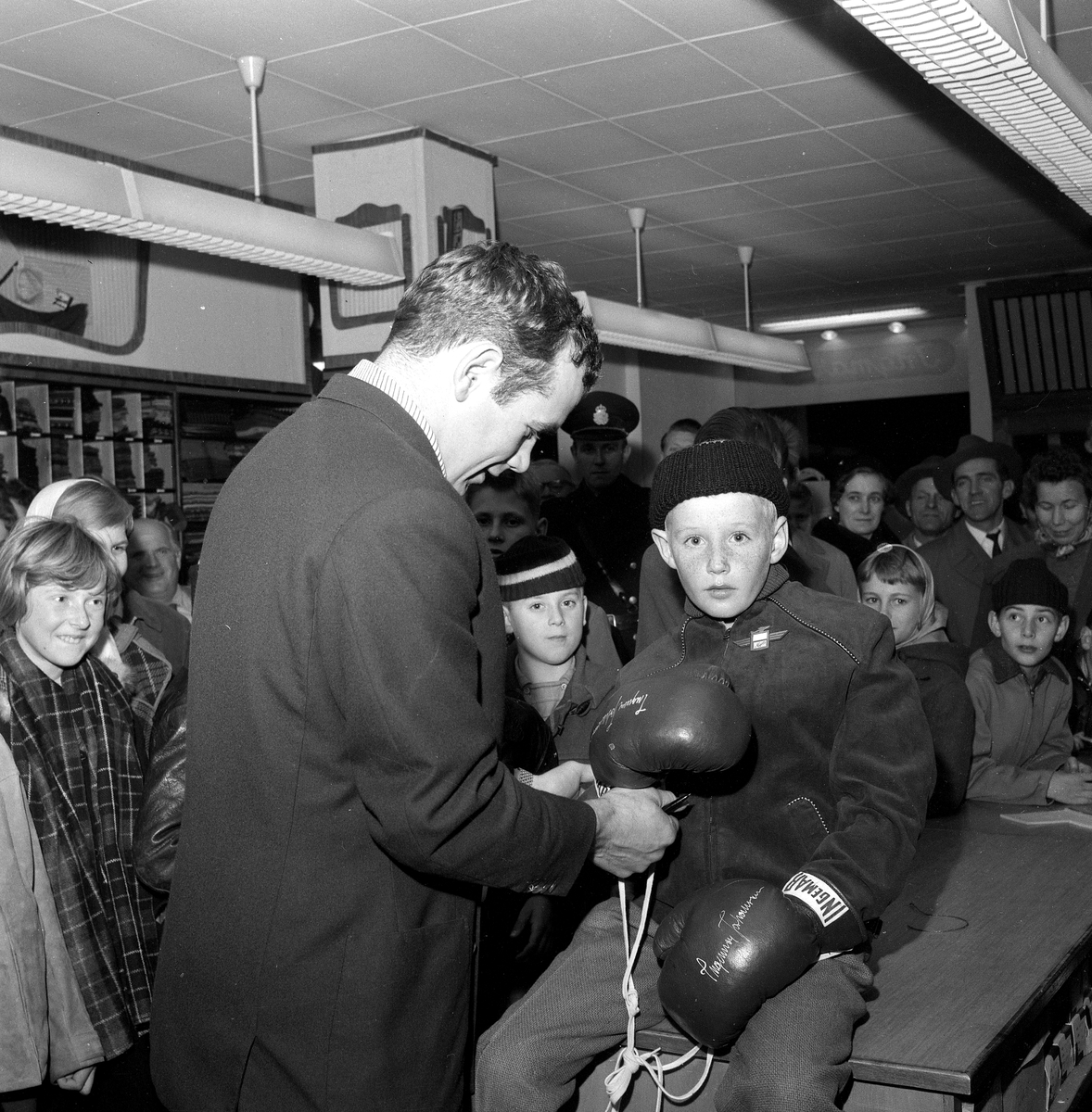 Titel: Ingemar Johansson i Örebro. Pojke vann Ingmars slogantävling. 24 oktober 1958.