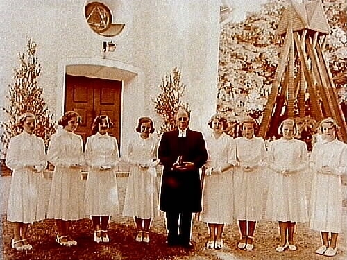 Privata konfirmander, åtta flickor och kyrkoherde Bror Strömberg.