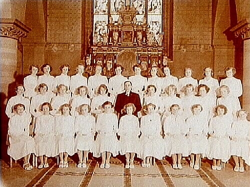 Konfirmander, 33 flickor och pastor Torsten Holm.