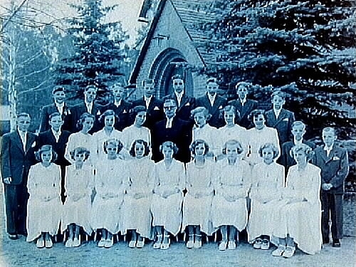 Konfirmander, 15 flickor, 12 pojkar och pastor K.E. Wolf.