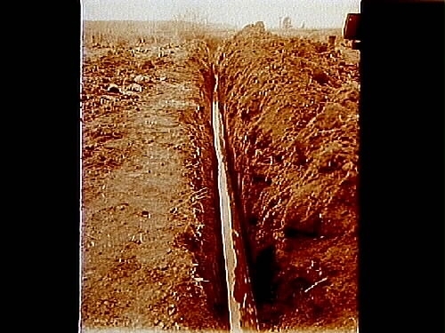 Mosjöängarna, dike på Mosjö äng grävt med maskin. Mosjö gård.
