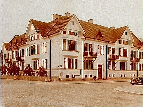 Flerfamiljehus i två våningar. Jugendåräglad fasad i gul slätputs. Hörnfastigheten Sturegatan 26 - Lagmansgatan 13.