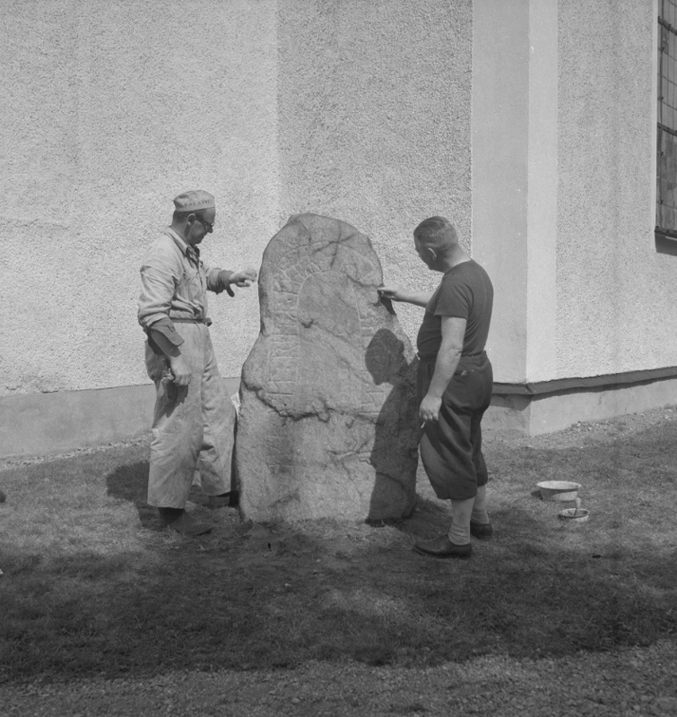 Stora Mellösa kyrka, exteriör. Runsten vid kyrkan, två personer.