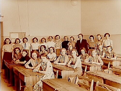 Engelbrektsskolan, klassrumsinteriör, 25 flickor med lärarina fröken Astrid Sund, klass 6f, sal 2 i Kommunala Flickskolan.