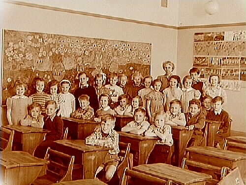 Titel: Engelbrektsskolan, klassrumsinteriör, 28 skolbarn med lärarinna fröken Emmy Söderlund, klass 2ai, sal 6-8.