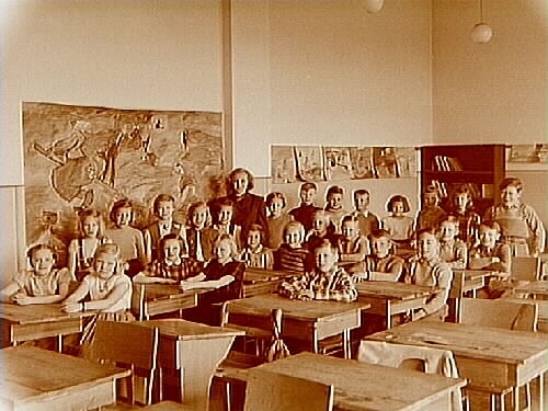 Titel: Olaus Petriskolan, klassrumsinteriör, 26 skolbarn med lärarinna fröken Marianne Hagerborn, klass 3Aa, sal 21.