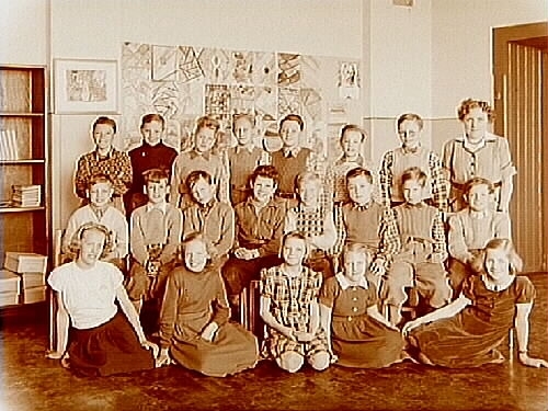Titel: Olaus Petriskolan, klassrumsinteriör, 20 skolbarn med lärarinna fröken Rut Widell, klass 4Aa, sal 22.