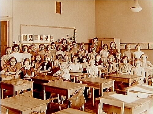 Vasaskolan, klassrumsinteriör, 35 flickor med lärarinna fru Lisa Dahlstedt, klass 4f, sal 19.