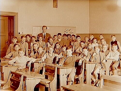 Vasaskolan, klassrumsinteriör, 32 pojkar med lärare Birger Karlsson, klass 4E, sal 2.