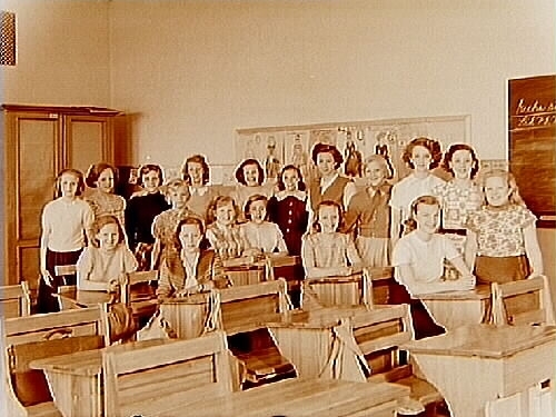 Vasaskolan, klassrumsinteriör, 17 flickor med lärarinna fru Hervor Kullnert, vikarie fröken Håkansson, klass 6e, sal 16.