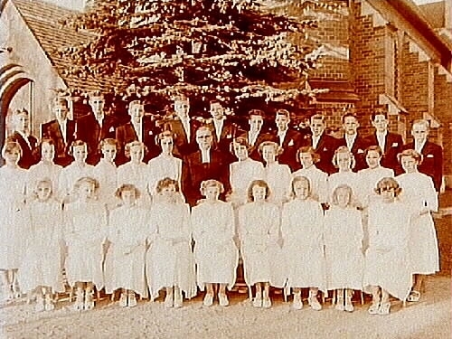 Konfirmander, 21 flickor, 12 pojkar och pastor K.E. Wolf.