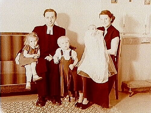 Familjegrupp, två vuxna och tre barn, rumsinteriör.