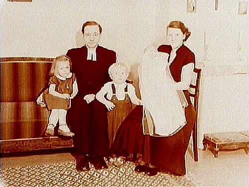Familjegrupp, två vuxna och tre barn, rumsinteriör.