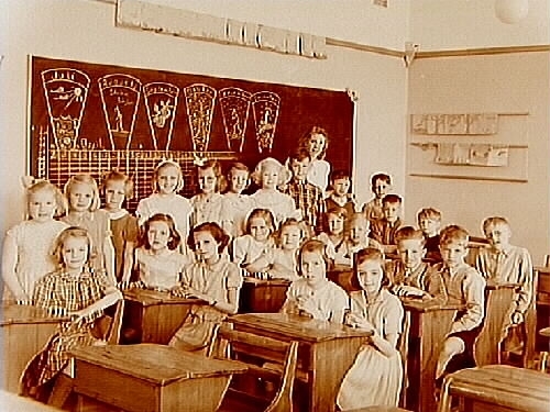 Titel: Engelbrektsskolan, klassrumsinteriör, 24 skolbarn med lärarinna fröken Sarah Sundgren, klass 2ag, sal 7.